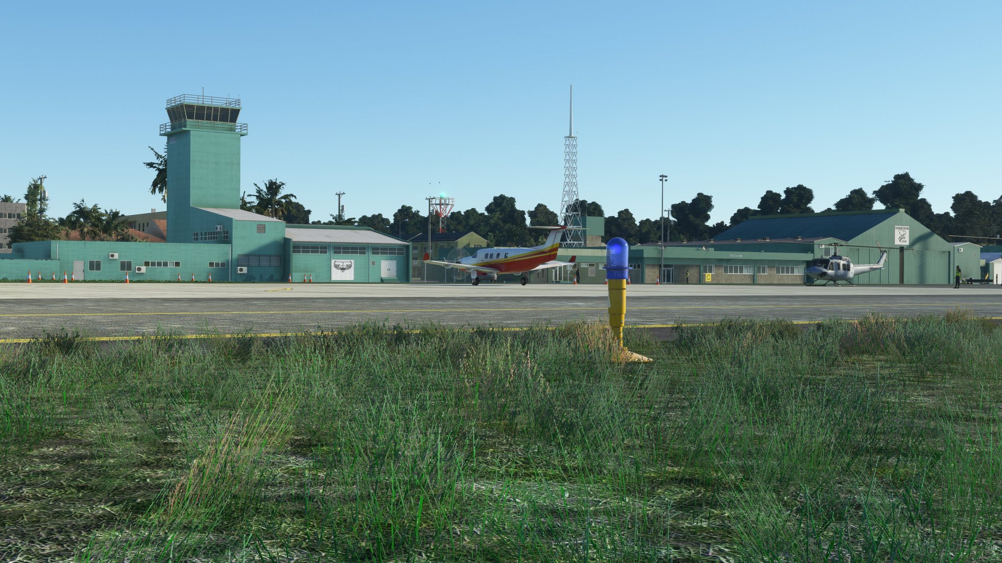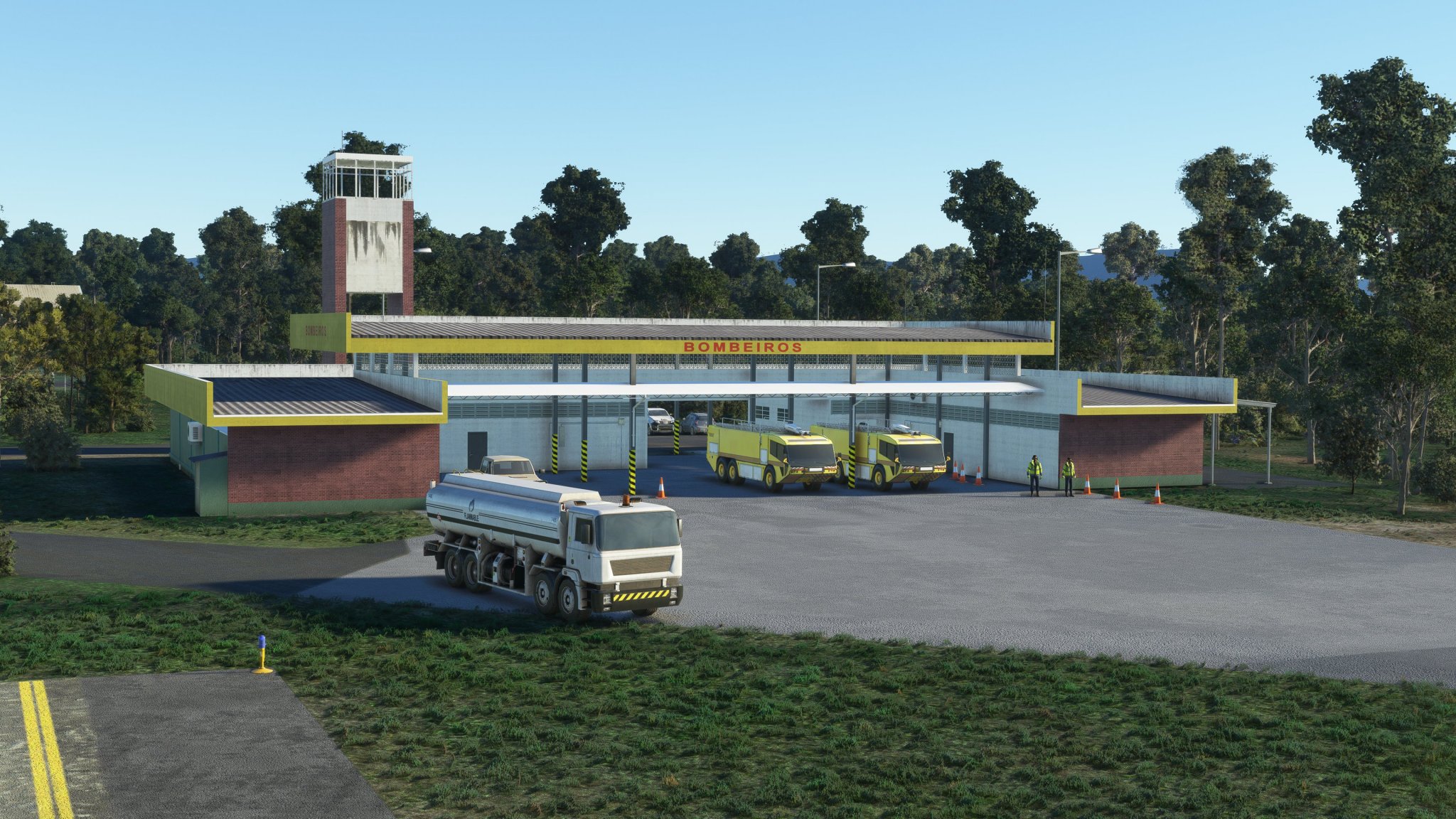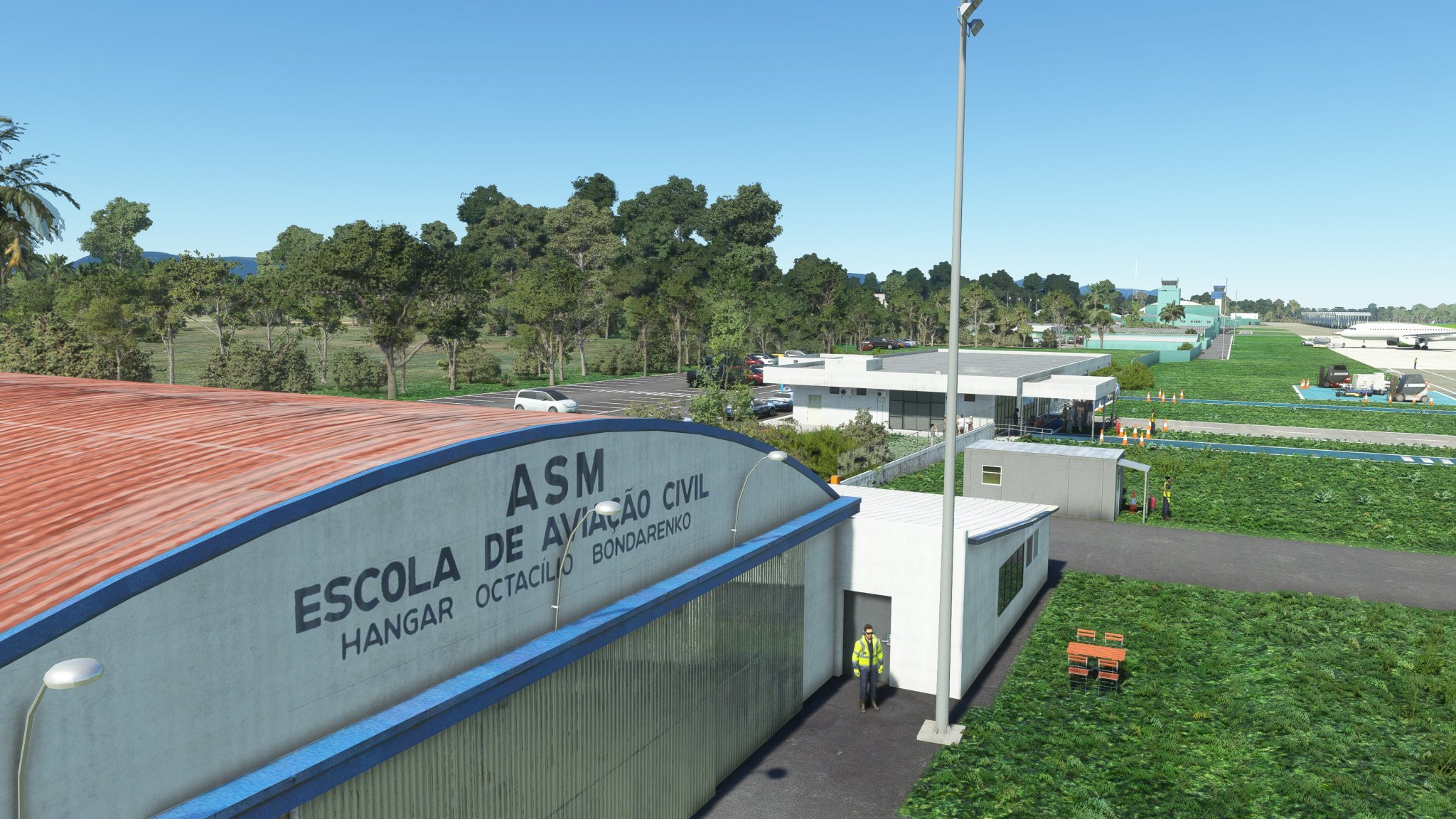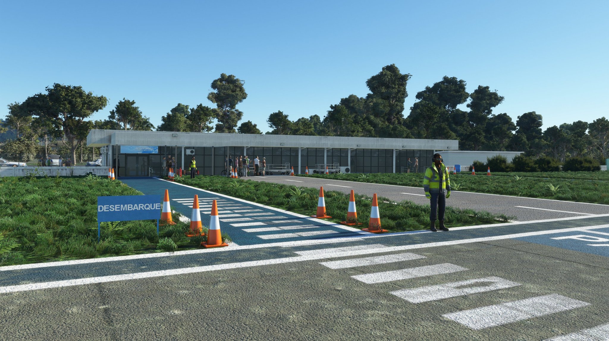 The scenery features an accurate rendition of the airport, with detailed buildings, realistic ground markings, PBR materials, custom vegetation, custom night lighting, and custom interiors for the tower and passenger terminal.
