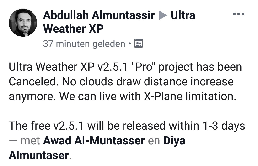 On the contrary, the “Pro” version has been axed, following its revelation on Monday. In their Facebook group on Monday, Abdullah Almuntassir stated that “Ultra Weather XP V2.5.1 “Pro” project has been Canceled. No clouds draw distance increase anymore. We can live with X-Plane limitation.”