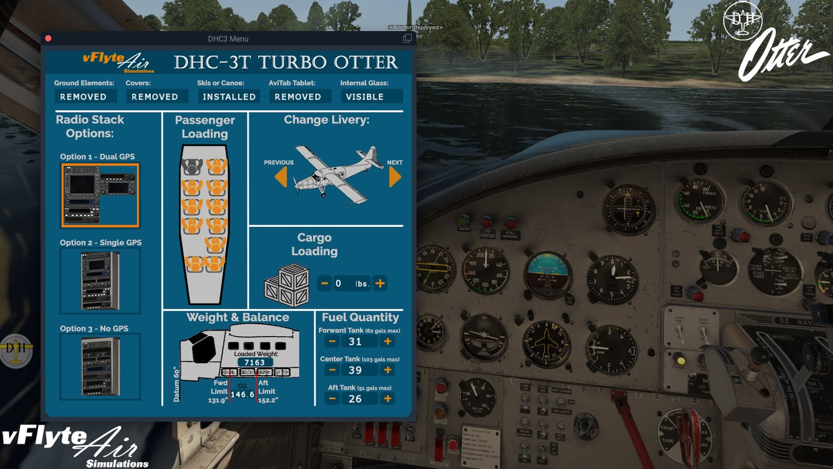 Writing on the x-plane.org forum, vFlyteAir said: “We’ve made some significant improvements to the original Milviz version in the past month and a half, including fixing the autopilot, improving the flight characteristics, creating a more functional menu, a new Harbour Air livery, more extensive “save-states”, dynamically calculated CG, faster fuel transfer rates when transferring fuel from the forward or aft tanks to the center tank, yoke can now be “thrown over” to the copilot’s side, more accurate fuel flow, flaps are now 45 degrees max down instead of 50 degrees (50 degrees was for the original radial engine model). We also completely rebuilt the model in Planemaker to ensure that the weight and balance is more accurate and realistic.