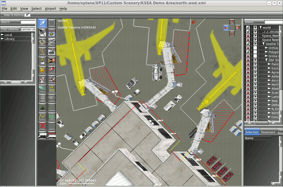 “Note the editing/selection of items is always based on the ground-level footprint,” wrote its developer Michael Minnhaar. “So it might be confusing at first to modify the scenery while the map shows the tilted view – but it greatly helps with vertically stacked terminal kit facades and terminal window/jetway alignment. The example here shows – I should have coded up this feature before I reworked KSEA recently …”