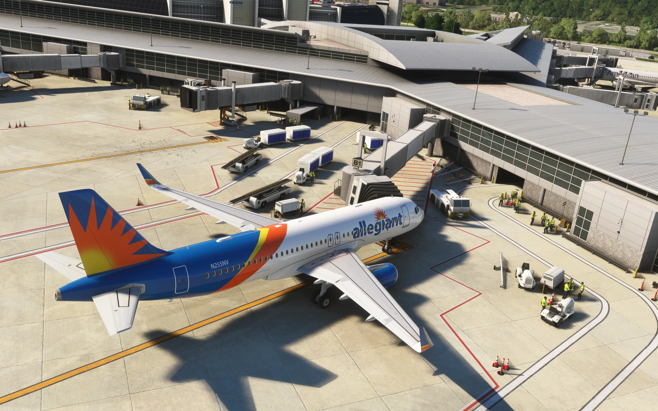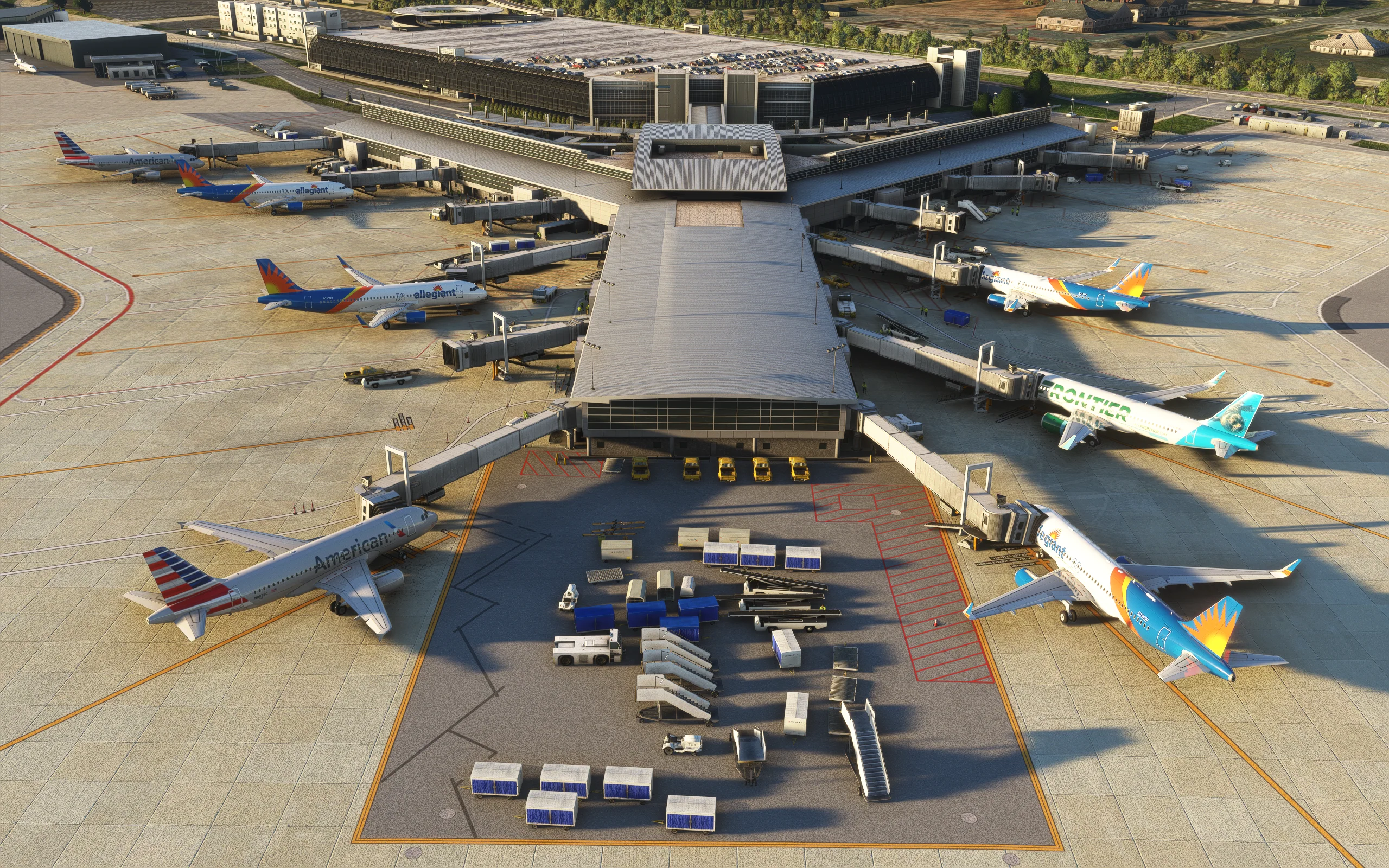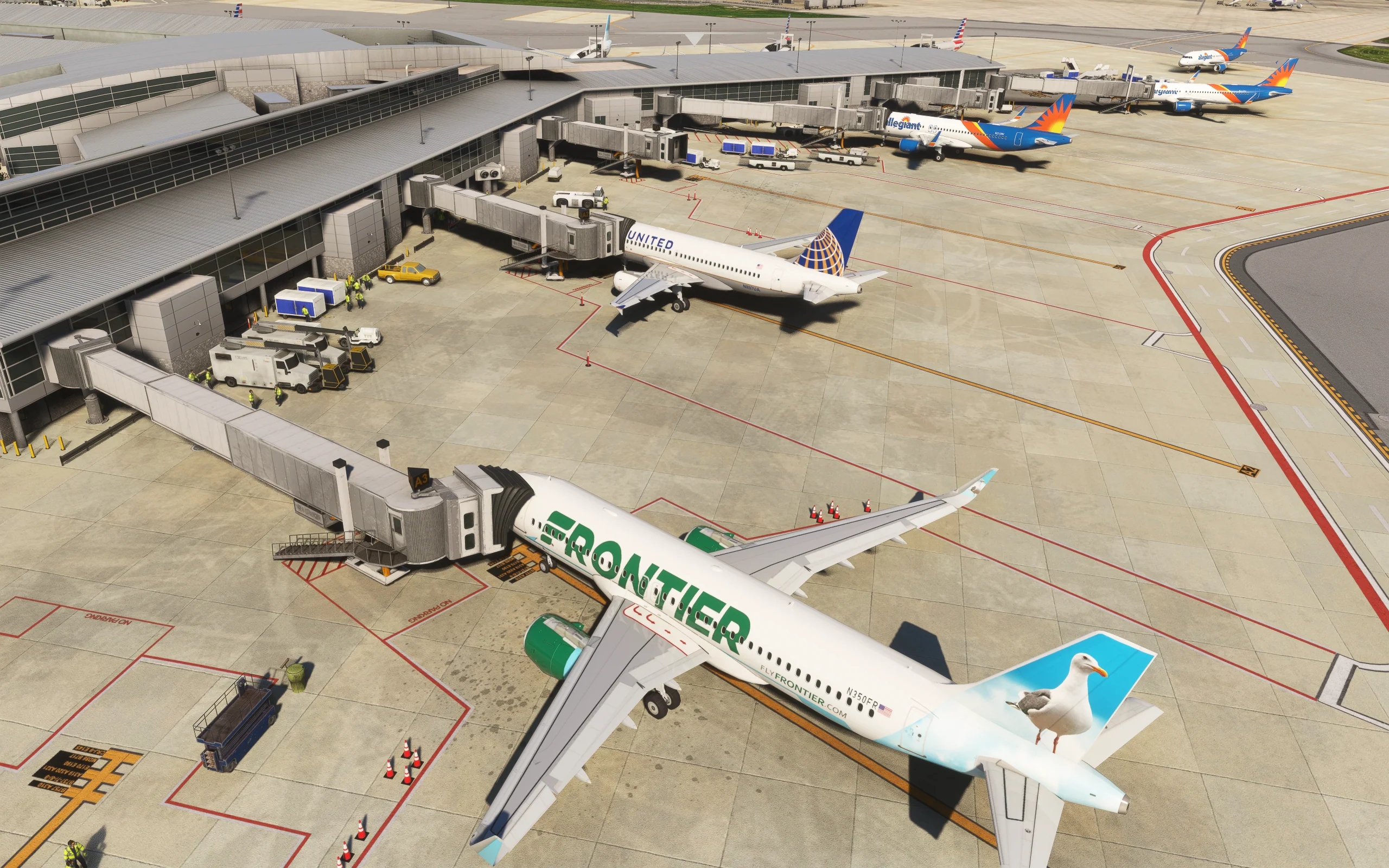 The scenery features an accurate rendition of the airport, with detailed buildings, high-resolution ground textures, PBR, realistic wear & tear, custom mesh, custom night lighting, and custom jetways.