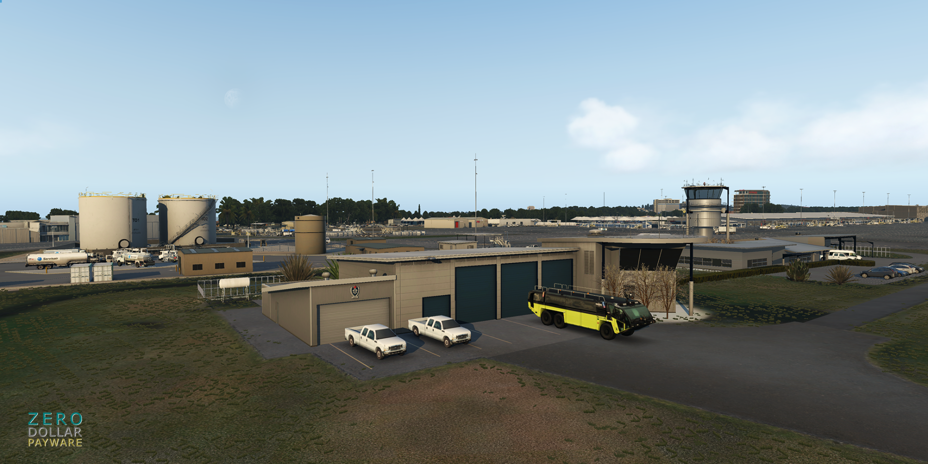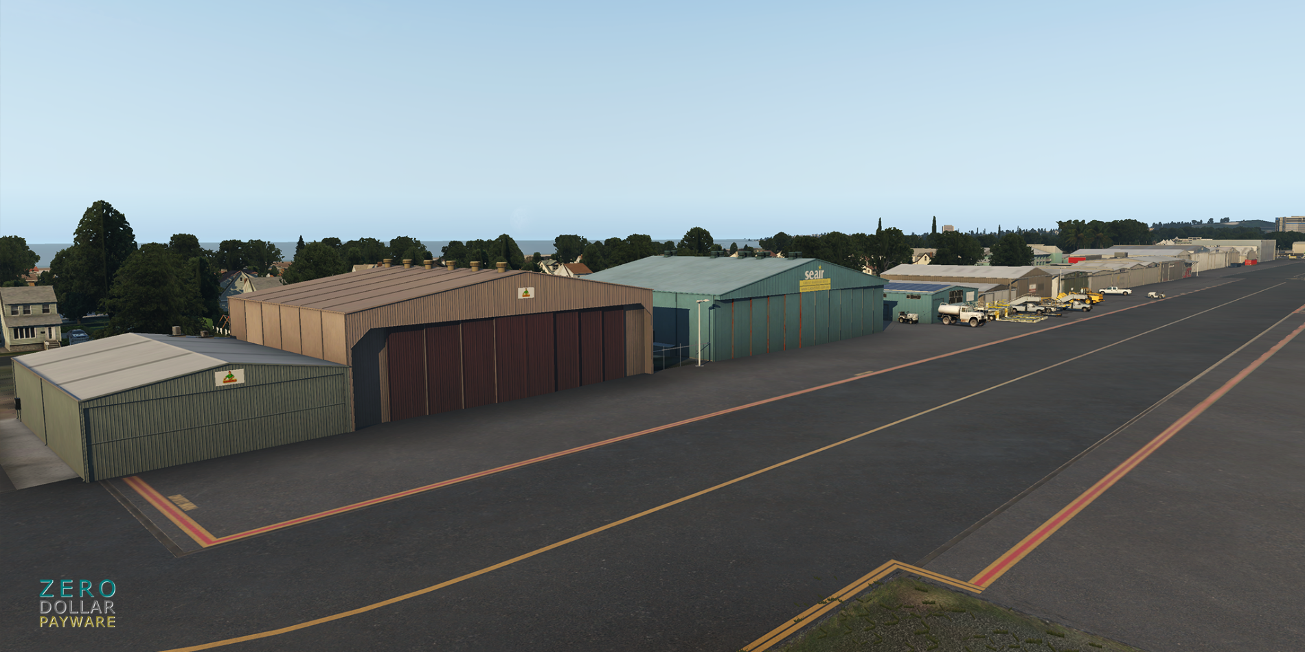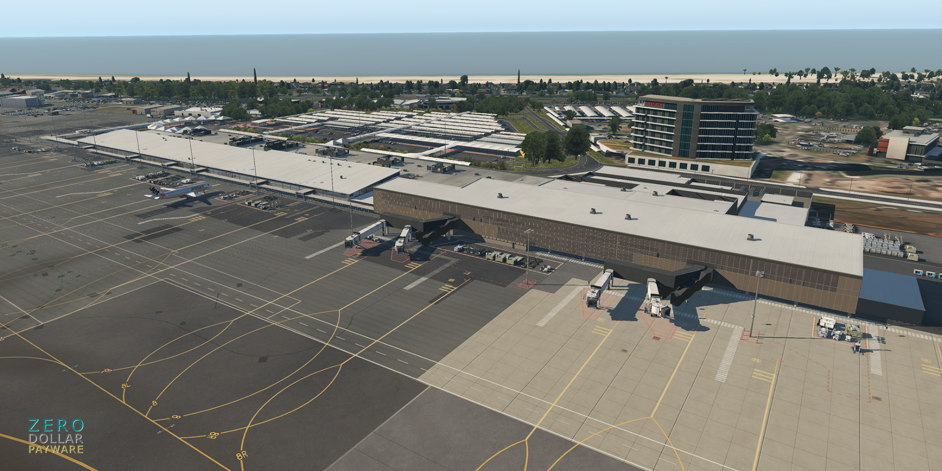 No detail went to waste with this release as ZDP has put their artistic skills to work by realizing the future terminal expansion in-sim, built based on architectural renders. The airport layout follows the current format, with additional gates worked in to reflect the terminal expansion. SAM is being used to animate the jetways in the new terminal, and marshallers are scattered throughout each gate. For the entire terminal complex, the team has modelled the interior as well. Scenery-wide features include standard frills such as custom modelled buildings and assets across the airport.